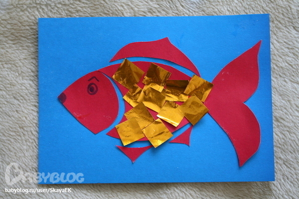 Очень простая и красивая аппликация. На листе картона можно просто нарисовать рыбку или же приклеить ее из бумаги/картона (как в данном случае). Одностороннюю фольгу нарезать небольшими квадратами. Затем на каждый квадратик наносим клей и создаем чешую. Вот и все! Золотая рыбка готова!