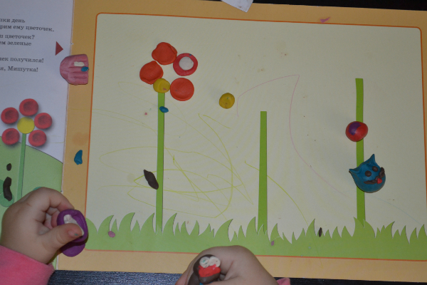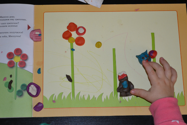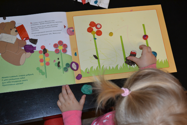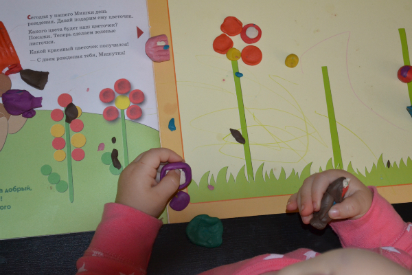 Появился интерес к пластилину...мять и катать колобки уже умеем. А еще надавливать пальчиком на маленькие шарики... тогда у нас получаются и конфетки для собачки и ягодки для мишки и снег....и цветочки