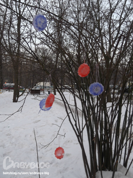 Был 20-тиградусныйй мороз,поэтому мы украсили куст возле дома,теперь наделаем кучу игрушек и пойдем в парк елку украшать. Столько радости!!!