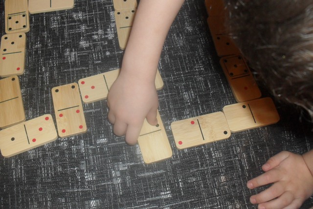 3) Затем (по методичке) решила попробовать поиграть в Домино-сумму. Это я его так назвала))). Так мы стали выкладывать сначала плашки, где в сумме получалось 5. Например, я хожу пятью и он должен сходить пятью. Если у него нет плашки с 5 точками, то он может взять несколько плашек, но в сумме должно быть именно 5 точек.