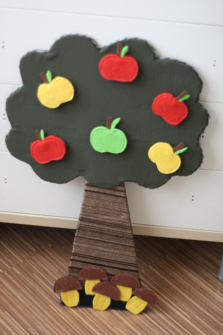 2. дерево с яблоками. Спасибо чудесной девушке Светлане за такую идею! Данюшка пока только отрываем и жует яблоки и грибочки, но в дальнейшем расчитываю, что и клеить будем, и считать, да и как декорация для кукольных спектаклей, мне кажеться, подойдет.