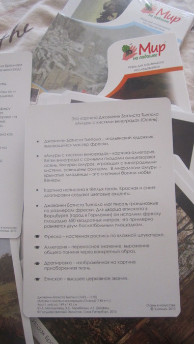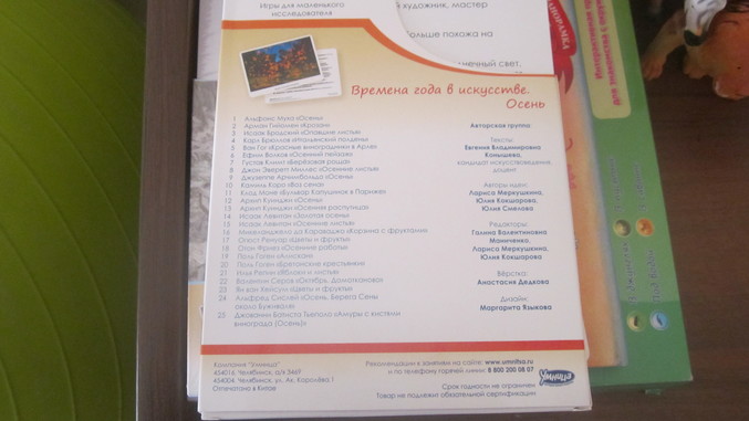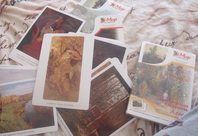 Девочки, хочу похвастаться своим новым приобретением. Давно являемся фанатами умницы, но из-за дороговизны комплектов, имеем возможность делать покупки не часто. А купить хочется многое. И вот наконец очередь дошла до «» - это 100 репродукций картин великих мастеров собранных по принципу времен года. На каждой карточке есть интересная информация о картинах, факты из жизни художников, характеристики направлений в искусстве. Очень хотелось познакомить сына с прекрасным с раннего детства (развесим репродукции по детской). Конечно, много он еще не поймет, но этот комплект на вырост. В любом случае, я верю, что если ребенка с раннего детства окружить прекрасным. Это поспособствует развитию хорошего вкуса. С ним как раз у меня большие проблемы, буду восполнять проблемы с сыном!))) И полезно и приятно))