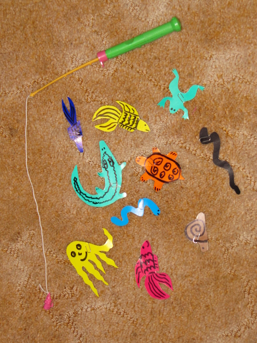 Нужна магнитная удочка. Морских животных я вырезала из цветного картона и прикрепила к ним скрепки. Удочкой дочка любит вылавливать животных, можно просить выловить конкретно конкретного.