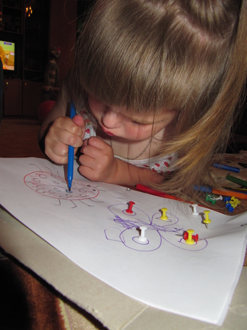 Вот такие "раскраски" я придумала. Под лист подложила картонку, нарисовала различные рисунки (у нас это были божья коровка, цветик, виноградик, бабочка), а Милашка втыкивала кнопки, можно дать задание подбирать по цветам!