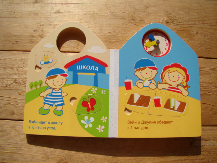 Книжка с часиками. В ней не только вкладыши, но 2 пазлика. Один на 4 элемента, другой, на последней странице, на 9 элементов. По часикам из этой книжки научила дочку определять время, но пока только часы (ровно восемь, ровно 10 часов и т.д.)
