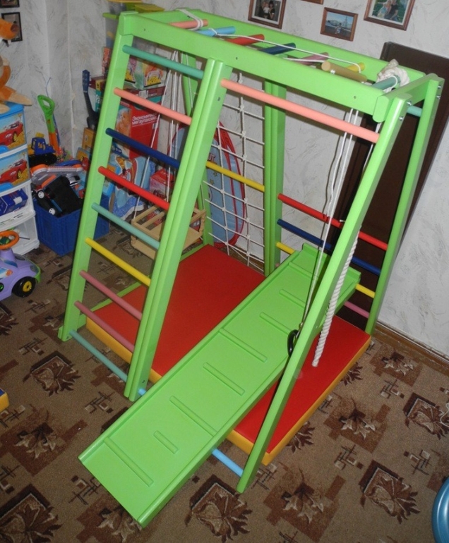 Старший сам лазит туда сюда аж до пота, заодно следит за младшим братом, иначе как бы я читала книжку ))) Сашка (младший) пока только по горке лазит, видите какая горка интересная, на вроде скалодромчика, ему так проще. Ну и наконец стал первые шаги на шведскую стеночку делать. Игрушку туда подвешу, тянется. Чаще всего банан, просто помешан на бананах.