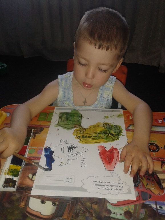 Потом мы раскрашивали рисунки на букву А (аптека, акула, автобус):