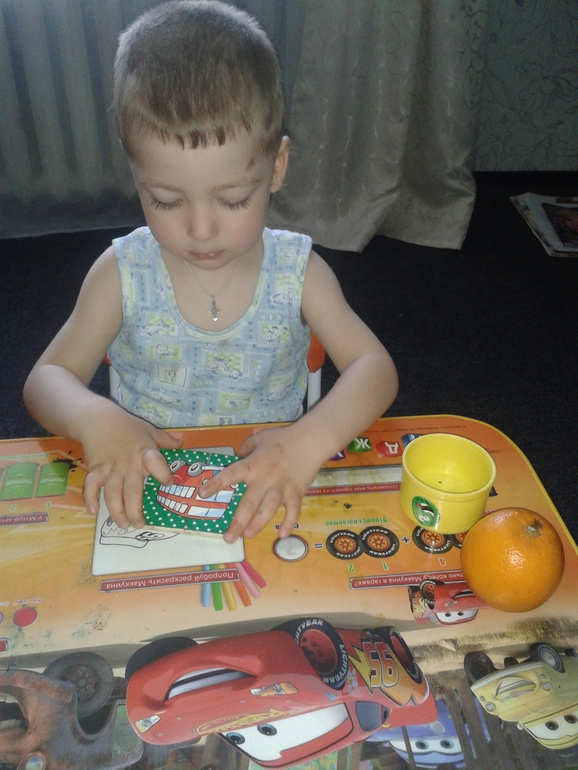 Максиму очень понравилась рассматривать предметы. Собрали пазл,у нас там оказался автобус и апельсин