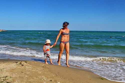 Теперь, мы ходим на море 2 раза в день, пренебрегая оранжевым зайцемонстром на детской площадке и компанией очаровательной Сонечки у бассейна, и Кирилл плавает от мамы к папе, и наоборот. Раз 15 плавает. Стоять на месте, поджидая ламантина в зеленых плавках - очень холодно, но любое поползновение вытащить Кирюху из воды сопровождается верещанием и проклятиями...