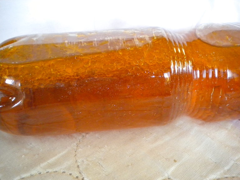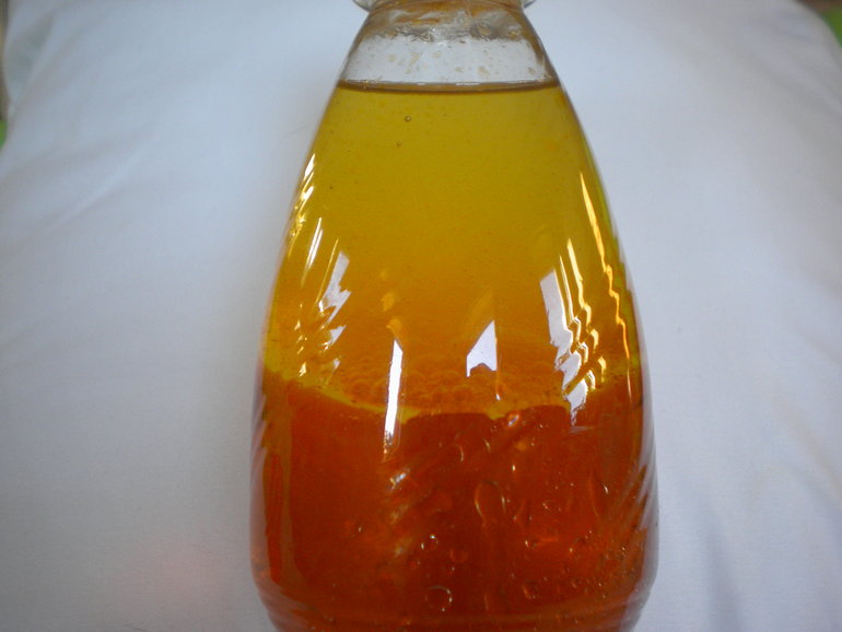 А точнее крашенная вода с маслом. Наливаем теплую воду, смешиваем ее с выбранным красителем(я надеялась что будет цвет апельсина, а вышел - лимонад), перемешиваем, и сверху льем масло. Когда бутылочка в спокойном состоянии то видно слои