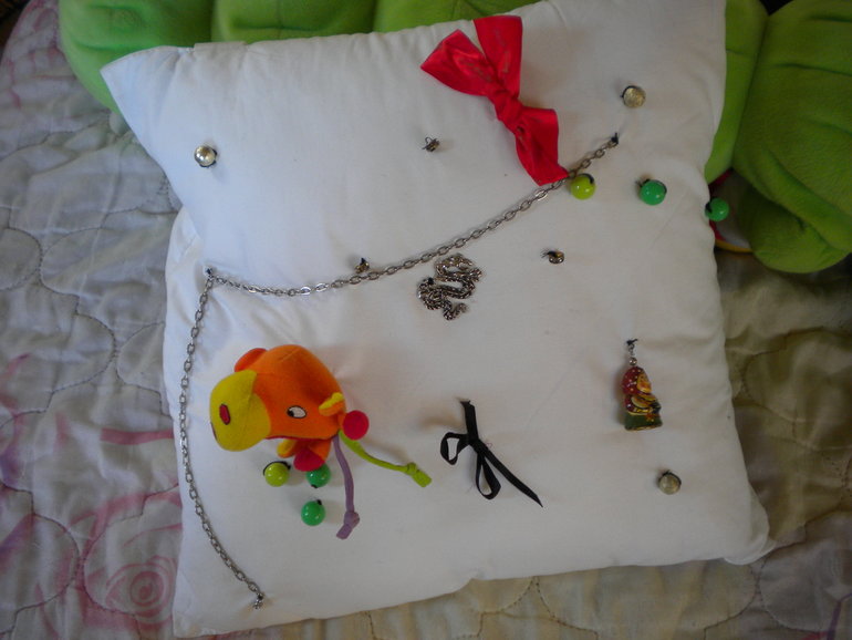 №2- подушка. С недавних пор сынку стало нравиться играть с диванной подушкой, а точнее с собачкой от молнии на этой подушке. Я решила ему разнообразить это занятие и вот что вышло: