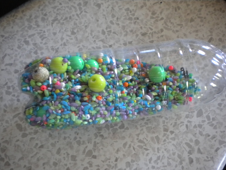 Берем бутылочку, туда все что под руку попадется. В моем случае- бусы, бисер и рис цветной(сама красила). Все это очень хорошо закрываем- погремушка готова! Ребенку нравится разглядывать содержимое, шуметь ей, и как бонус- можно об крышку почесать десна)))Кстати, благодаря рису она больше шуршит , чем гремит . Пробовала греметь чисто бусами с бисером- голова не выдержала..