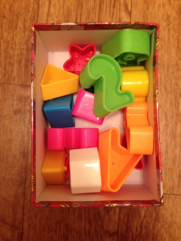 Во второй коробочке были детали от сортеров, разные фигурки, буквы, цифры.