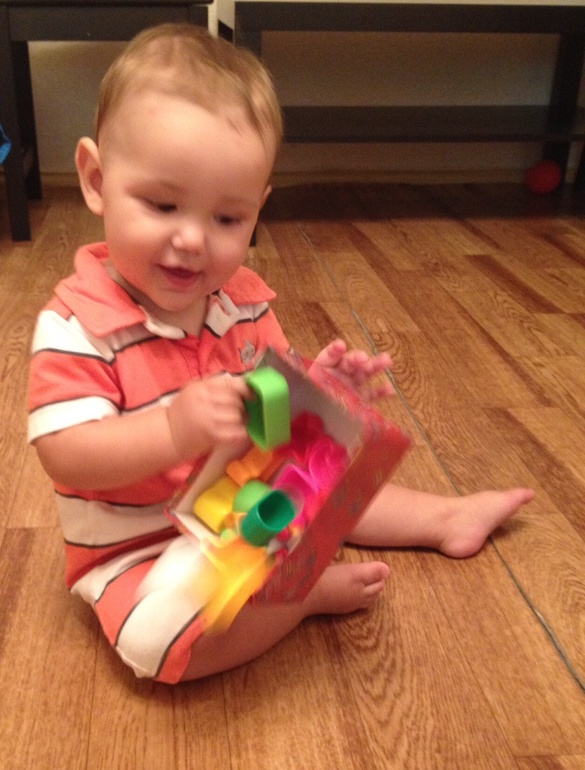 Я просила Ваню доставать по одной штуке и отдавать их мне. Доставал он хорошо, а вот отдавать особо желания не возникло. Игрался и просто бросал рядом. Потом начали складывает обратно. Доставать конечно интересней)