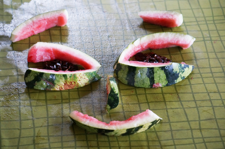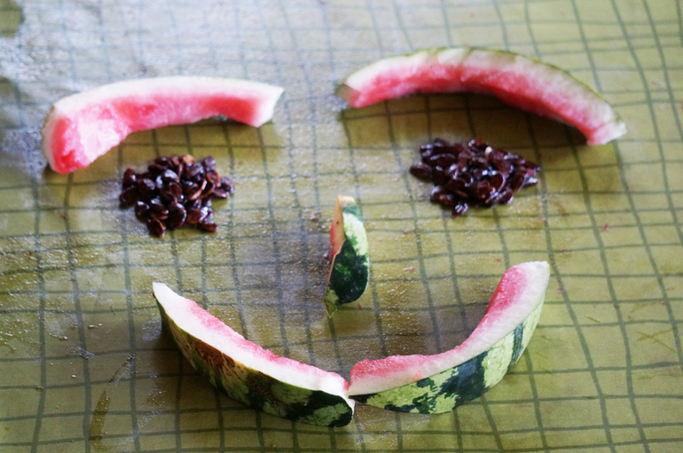 Развитие детей второго года жизниАрбуз - не только безумно вкусное лакомство, без которого не проходит ни одно лето, но еще и поле для творческой фантазии! Беспокойные мамы удаляют все косточки перед тем как дать дольку, а мы с Машей наоборот увлеклись игрой в кости, и вот что у нас получилось!
