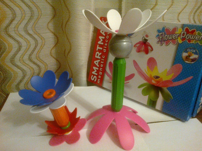 Вот такой у нас девичий набор, называется Цветочная энергия. В него входит 11 деталей, все магнитные: шар, две палочки разной длины (зеленую я измерила - 13 смНа коробке нарисован пример деталек, рекомендованных для игры с года, они еще крупнее. Есть наборы более продвинутые - паркинг, скажем, с пяти рекомендуют. Магниты разной силы, от цвета зависит, притягиваются они или отталкиваются. Кроме специальных наборов, есть базовые - с прямыми и изогнутыми палочками, шариками, другими деталями. Подарок пришелся очень кстати - ребенок с восторгом к нему отнесся и собирает разные комбинации цветочков сама и с моей помощью. Потом несет папе - хвалится. Так что, вдохновившись, я заказала в подарок сыну нашей крестной на 2 года набор Экспресс с машинками (написано, что с 2 лет, наверное,крупнее, и там 15 деталей). Придет - посмотрим. Наш набор есть здесь
