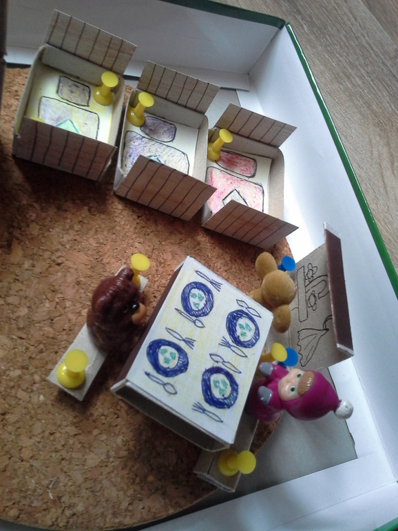 Почти всё я сделала из спичечных коробков; крепится всё посредством силовых кнопок или зубочисток. Я не стала делать детсад на бумаге. Так как на пробке всю мебель и антураж можно передвигать, менять местами, добавлять что-то новое. Для новых игр и театральных постановок. В голове уже есть парочка идей.По мере воплощения всё расскажу)))