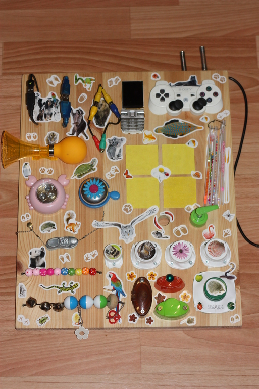 Итак, в следующем бизиборде решено сделать побольше разных крышек с сюрпризами, резинок с разными бусинами, трубочек и прочего, что издает звуки и светиться, так как это больше всего нравится ребятне.