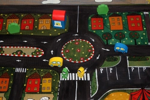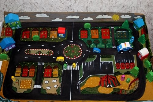 Развивающие игрушки своими рукамиВ продолжение фермы в коробке,неспешно доделала город.Сейчас мы с дочкой активно играем машинками,поэтому город с дорожной развилкой нам совсем не повредит.Я заметила,что в процессе ролевой игры дочка схватывает новые слова налету,да и понимает о чем речь,в отличие от карточек.Теперь сначала игра,а на закрепление карточки по теме.Вот так получилось: