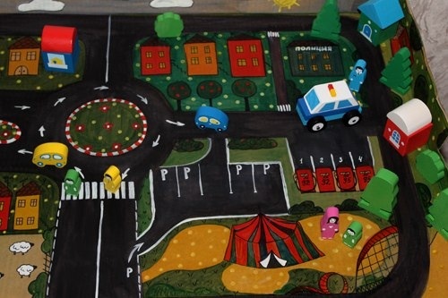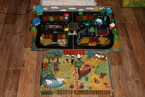 На фото не совсем хорошо видно,но город примерно раза в два больше фермы,чтобы можно было долго катить машинку.К Новому Году есть еще один большой проект,а пока играем с этим.