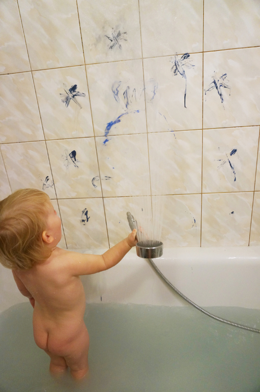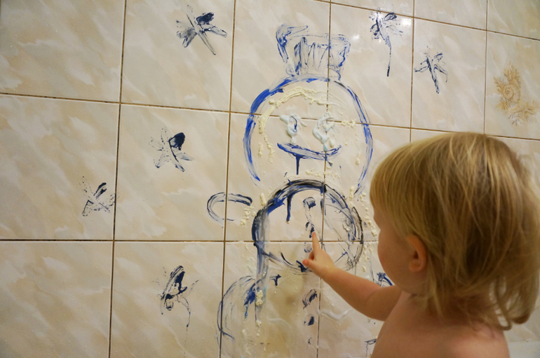 Развитие детей второго года жизниОбычно Маша очень любить принимать ванну, а тут как-то уселась за мультики и не хотела идти мыться. Пришлось сказать, что в ванне ее ждет сюрприз! Я нарисовала снеговика при помощи пальчиковых касок, взбитых сливок из баллона и папиного геля для бритья. Герой получился на скорую руку, но привел дочь в восторг! Мы долго его мазюкали, а потом мыли душем, и от снежного героя не осталось и следа!
