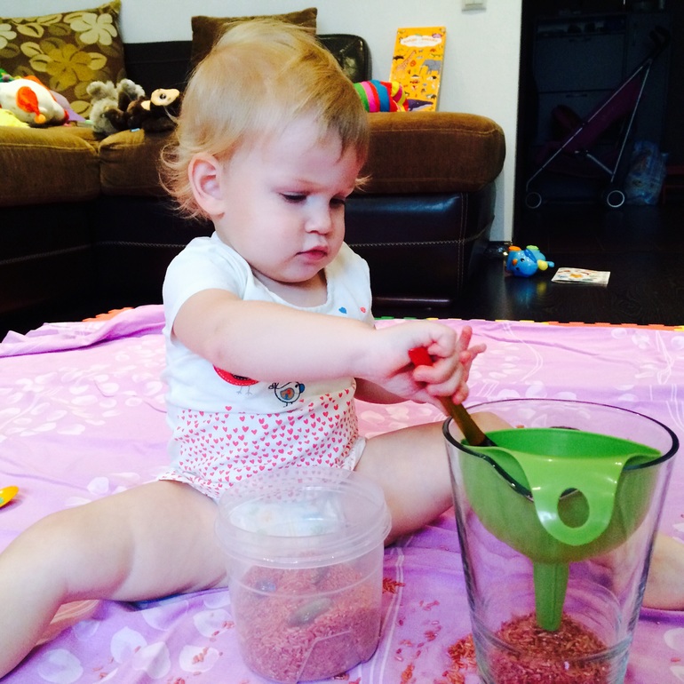 Да у нас трудно назвать это занятиями, все как правило стихийно, в виде игры. А чаще, когда мне надо минут 10-15 свободного времени, чтобы приготовить поесть, например. Коробочки с макаронами начала давать месяцев с 9-10, очень редко, просто повазякаться и разбросать все по кухне. Потом в мае мы переехали на дачу, на природе и выдумывать не надо ничего, в городе активно исследовали песочницу и газоны, кусты во дворе, в общем летом специально вообще не занимались. На фото в посто дочке около 1.3, это уже осень. Я могу спокойно оставить Варю с подобными коробочками, она не тянет все подряд в рот, хотя всё равно бдительность не теряю. Если ребенок все в рот тащит, лучше осторожнее со всеми этими крупами, камешками и т.п.