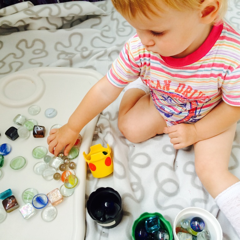 Из хитов - стеклянные камушки из фикс прайс! У меня 3 упаковки камушек разных форм и цветов. По ним мы также изучаем понятия гладкий/шершавый, два дня потом ходили и гладили в квартире все поверхности)) А как здорово катать круглые стеклянные шарики по кафелю, они издают такой звонкий дребезжащий звук!