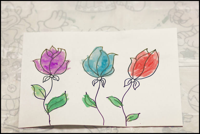 Разукрашиваем мы уже аккуратнее, чем, скажем, полгода назад. Например, вот. Я рисовала цветочки, дочь заполняла: