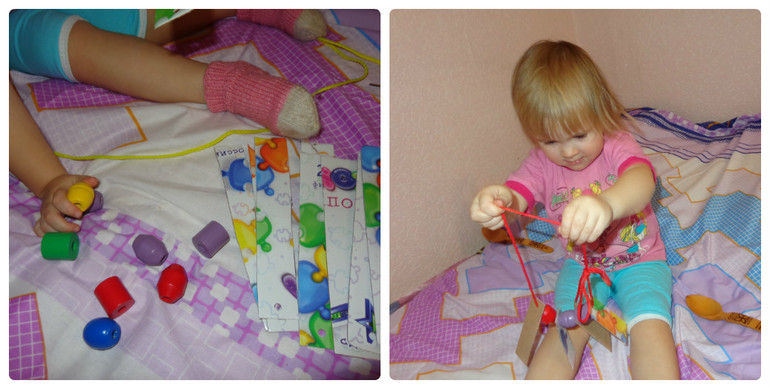 Сначала посмотрели видео с трещоткой, но т.к. у нас такого инструмента не было, мы сделали его сами из кусочков плотного картона, бусин и шнурка.