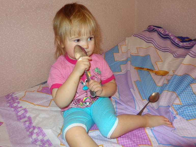 Первым делом Алиса стала исследовать деревянные ложки, оказалось, что они очень отличаются от обычных, которыми мы кушаем, температурой, весом, внешним видом и звуком, который получается, если ими постучать: