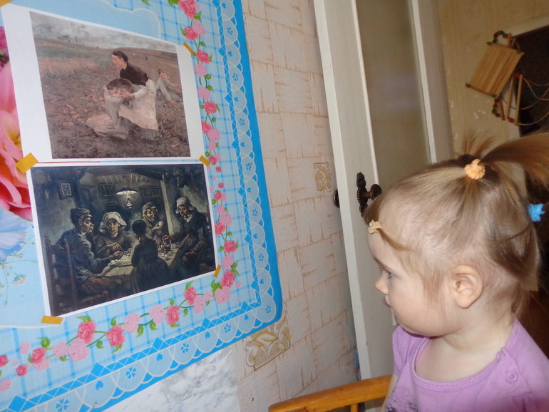 -Рассмотрели картофель в живописи, от репродукции картины Ван Гога "Едоки картофеля" (1885), Алиса просто не могла оторвать глаз. Рассказывала, кто чем занимается на картине, спрашивала, как кого зовут и т.д.