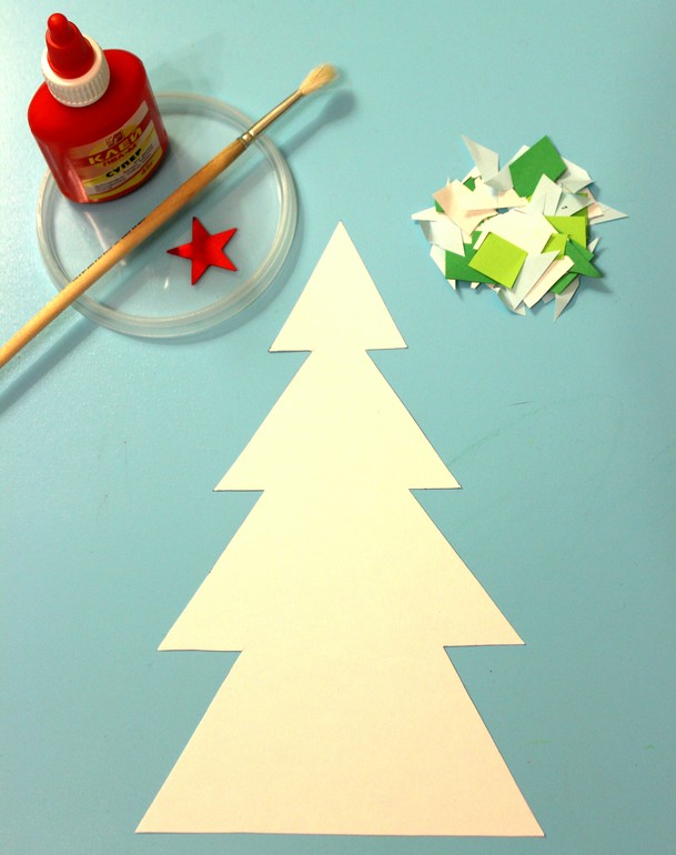 - вырезанная елка, нарезанные бумажки, клей ПВА и емкость для него, кисточка и звездочка. При желании можно добавить еще много всего, но мы пока начали с мАлого.