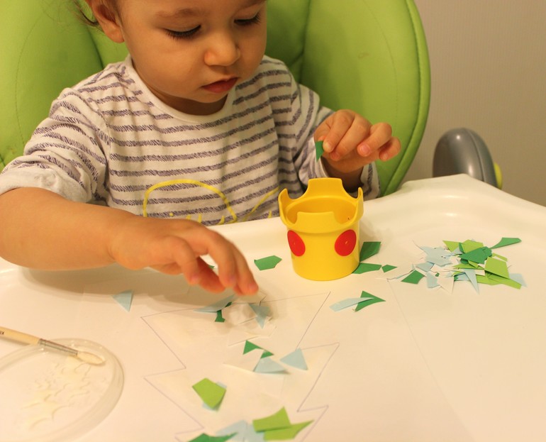 Мне даже объяснять толком ничего не пришлось (кисточкой она владеет уже хорошо, т.к. мы много рисуем акварелью), я только успела показать, как приклеить одну бумажку, как она забрала у меня материал и начала с важным видом заниматься, и в процессе изучала текстуру клея (на удивление, она его не испугалась.... я просто помню, в начале творческого пути, эти полные слез глаза, когда на ее пальцы попала гуашь).