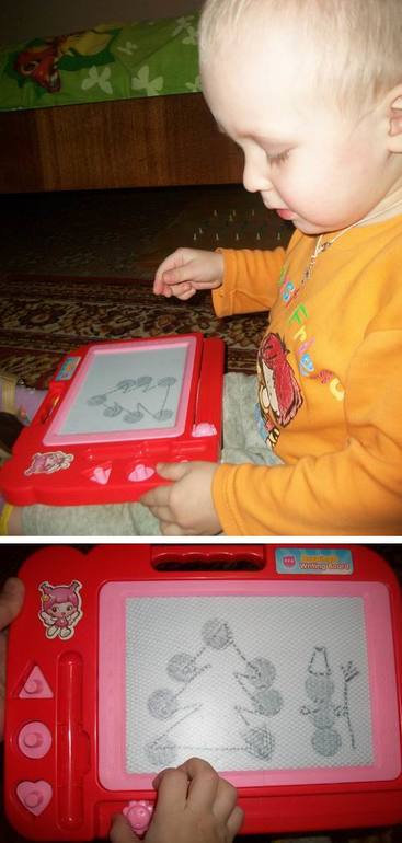 Еще на рисовальной доске (не знаю, как она правильно называется) я рисовала елочку, а Максим приделывал штампиками шарики на елку. В завершение я штампом сделала рядышком снеговика с метлой