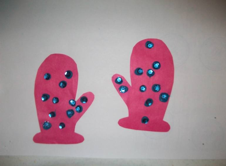 Еще мы делали праздничные варежки: сначала клеем-карандашом Максим сам приклеил одну варежку (а я другую), потом мы их украсили пластилином, и поверх пластилина пайетками