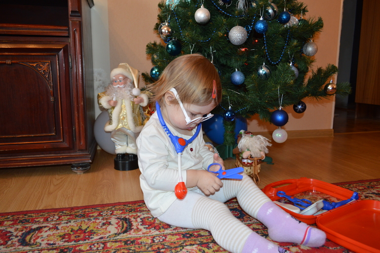 31 декабря Катюша спокойно легла спать по своему обычному графику, в 9 вечера, и тем самым дала нам не менее спокойно встретить и отпраздновать Новый Год. А утром 1 января побежала искать свой подарок под елочкой.