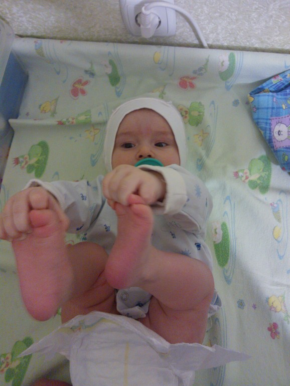 Развитие от 3-6 месяцевТак забавно, вчера Евгеша обнаружила у себя ножки. После купания, пока я ее обрабатывала, Женька узрела свои ножки и стала хватать их ручками:-) Сегодня весь день их пытается в рот засунуть, но пока до рота не достает:-).