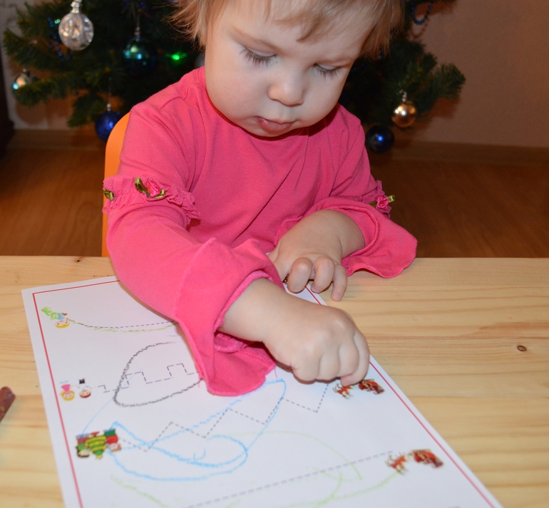 6. Проводилки. Сначала я проводила Катюшиным пальчиком по линиям. Потом выдала мелки и попросила нарисовать их. Старалась! Координация еще не та... но по крайней мере не размалевывала рисунок по своему, пыталась вести ручкой по пунктиру. Я не помогала.