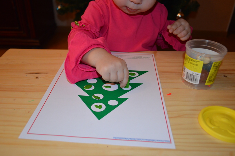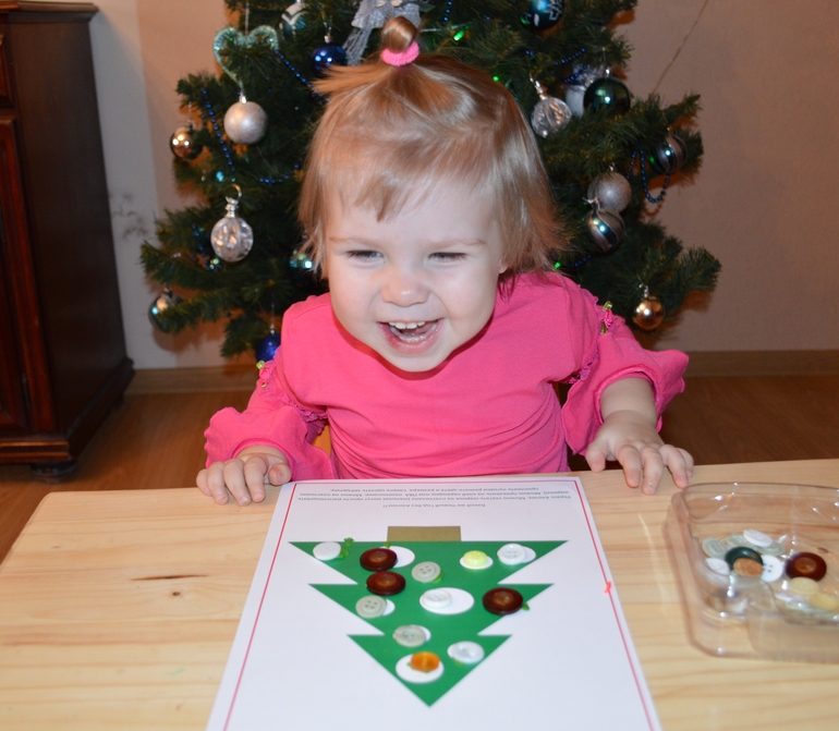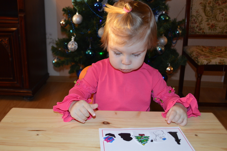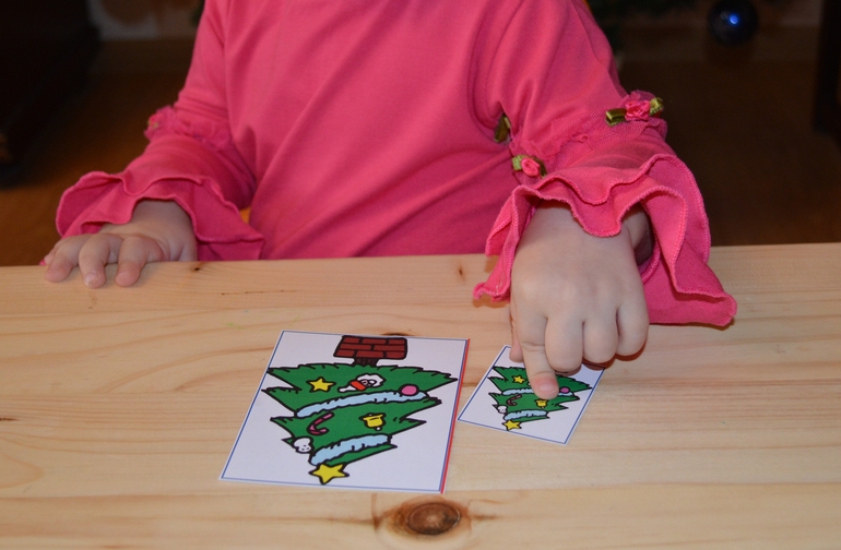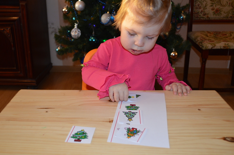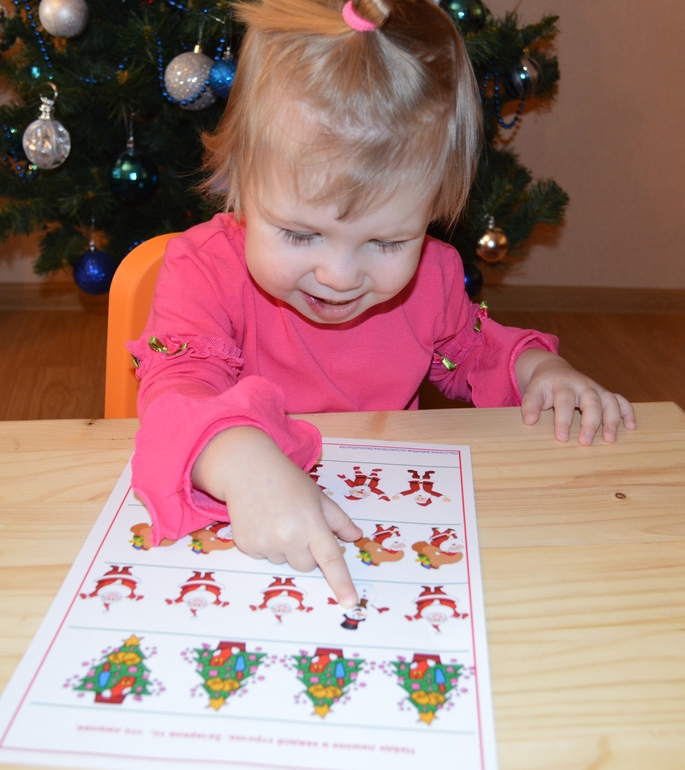 1. Находили одинаковые елочки. В задании нужно было соединить их линиями, но линии это для Катюши еще сложно. Поэтому я просто отрезала половину и мы играли в лото.
