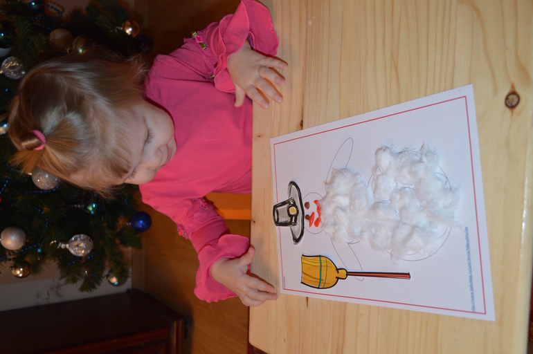 В конце немного я помогла украсить нашего снеговичка. Катя намазала клеем шляпу и метлу, вместе мы их приклеили (я показала куда приклеивать, потом совсем немножко подправила) И из пластилина лицо тоже пришлось мне помочь сделать - Катюша оторвала кусочки пластилина и пыталась скатать шарики, а я приклеила в нужные места. Вот какой красавец получился!