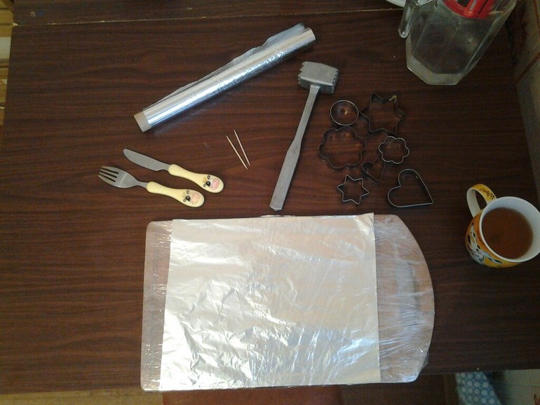 Он взял формочку сердечка, поставил ее на фольгу, постучал по ее периметру, затем убрал формочку, перевернул фольгу и поставил формочку примерно в то, выдолбленное сердечко, сделав еще пару ударов молоточком. Тем самым получилось выпукло-вогнутое панно из фольги, которое мы наклеили на досочку, и повесили над Диминым столом.