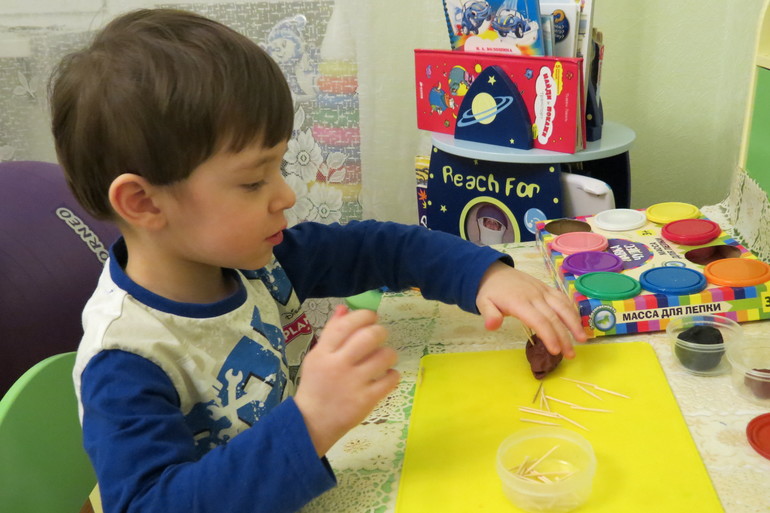 Пластилиновый ёжик. Прочитали сказку Л.Куликова "Как ёжик стал колючим".Потом приступили к лепке: ёжик один - иголок много.