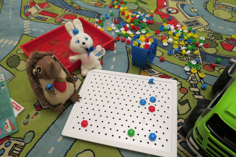 Мозаика. Плюс мелкая моторика. У зайчика и ёжика только один элемент, на ковре много, на полянку Лёня воткнул мало (выращивали ягоды).