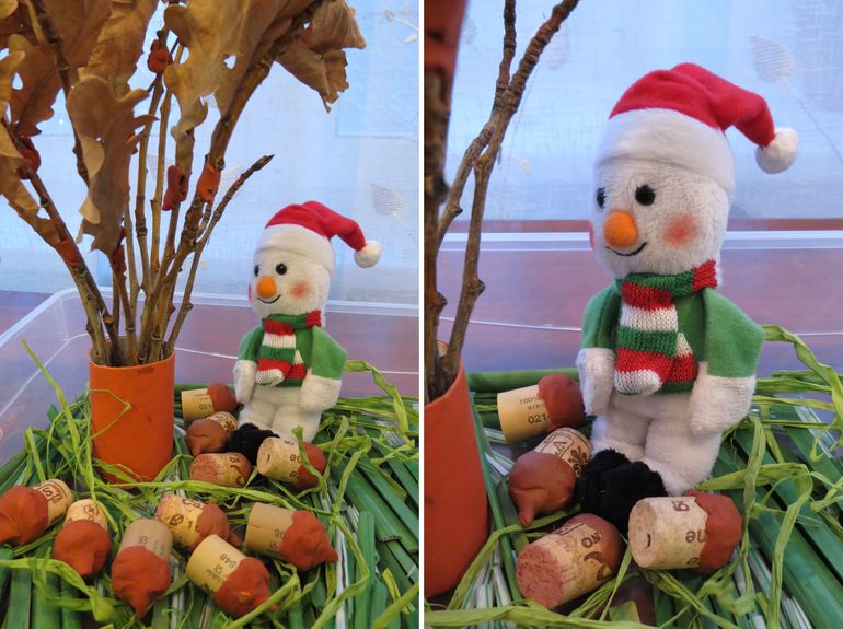 Жил один человечек Томатик, у которого совсем не было друзей. И решил он отправиться на их поиски. На лужайке рос один дуб. А под ним было много желудей. Может это друзья? Собираем один, еще один, еще один. Много желудей собрали в ладошки. Но когда их разжали, все желуди рассыпались. Здесь мы с Лёней заодно повторили понятие "ни одного". (К сожалению желуди у нас не сохранились, сконструировала из пробок и пластилина).