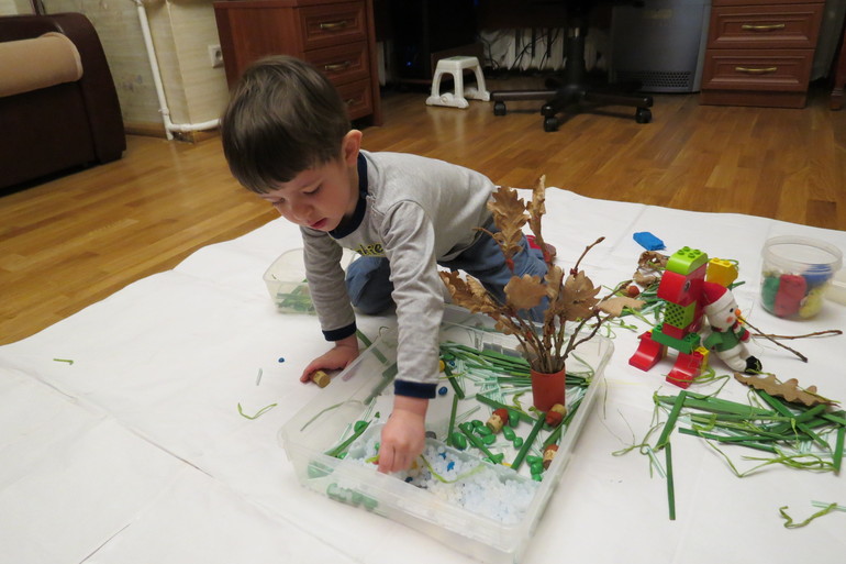 Итоги: Понятия "один, много" Лёня уже знал в совершенстве, но инсценировка ему очень понравилась. Особое впечатление произвело то, что с Томатиком никто не хотел дружить. После сказки Лёня неоднократно собирал в коробочку листочки, веточки, камешки, потом приносил их Томатику. Ну и конечно долгие игры с сенсорной коробочкой.