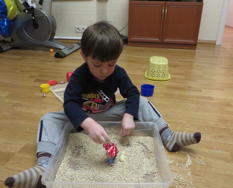 Дождик из крупы. С крупами Лёня возиться обожает. Сегодня пошел дождик, и Пятачку понадобился один зонтик. Но мы ждем друзей, поэтому зонтиков нужно много.