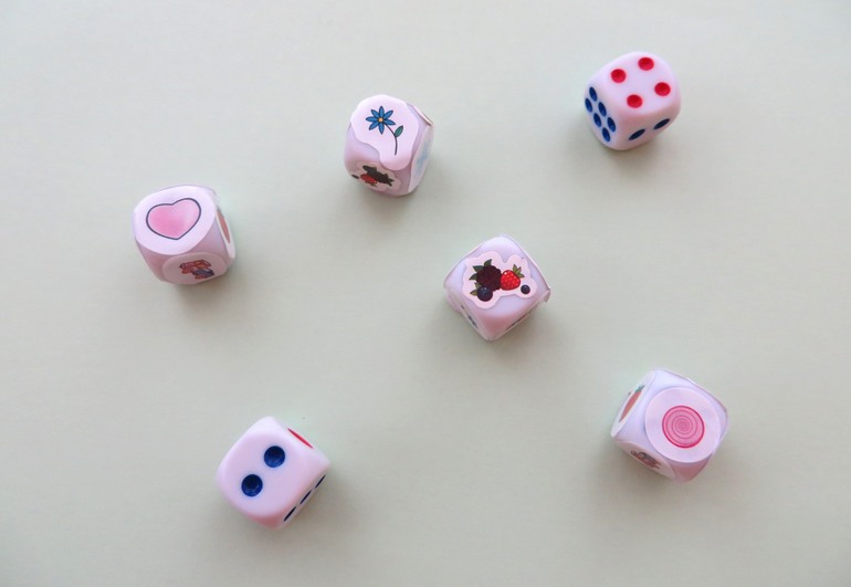 А теперь о том, как я адаптировала игру для малышей. Вместо точек на грани кубика наклеиваем рисунки. Каждый вариант делаем в двух абсолютно идентичных экземплярах. Один кубик - будем кидать и запоминать. На втором - осуществлять поиск выпавшей картинки. Для картинок я использовала крошечные наклейки из альбомов Фикс-Прайса.