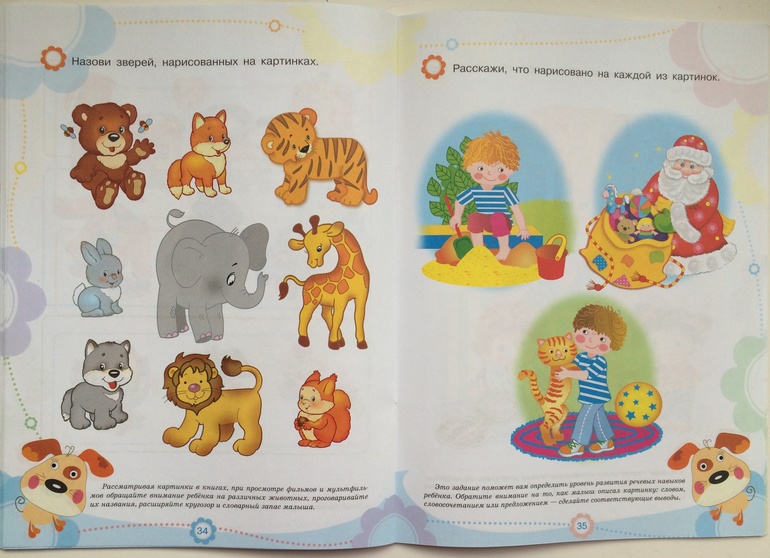 Авторами предлагается также интересный способ отслеживания уровня знаний малыша. На каждой страничке внизу собачка, рисуем ей ротик в соответствии с уровнем освоения. Приятно что при следующем подходе виден прогресс ребенка по данной теме. Также на каждой странице внизу даны советы о чем побеседовать с ребенком, на что обратить внимание, во что поиграть.