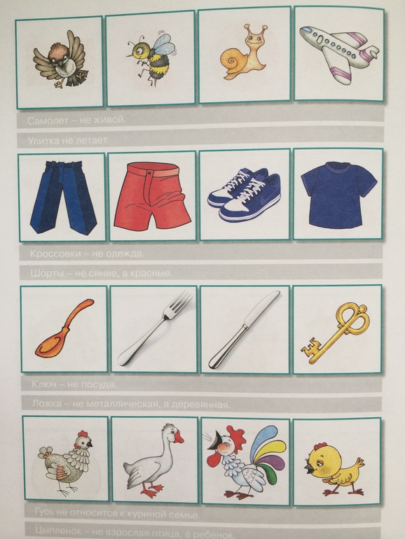 Все задания интересные, под ними на серых полосках белым шрифтом даны подсказки родителям. Так вот, интересно, что ку меня всегда возникает первым в голове первый ответ, ан мой взгляд самый очевидный. Например, самолет - не живой. У Лёни же наоборот чаще всего (чаще, т.к. все же не со всеми заданиями еще справляется) возникает второй вариант - улитка)) и даже на вопрос почему отвечает верно)) "не итает, а позет" (не летает, а ползет)...