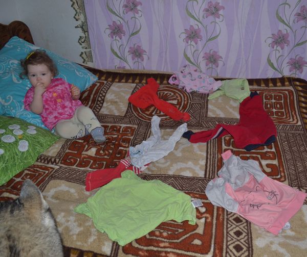 2. Разбирали высохшие вещи, показывала ей и называла. Все закончилось примеркой платья, по ее просьбе (не знаю каким словом правильно выразить, детка начала сама натягивать платье через голову, я помогла), и шапки (это вообще наша большая любовь)